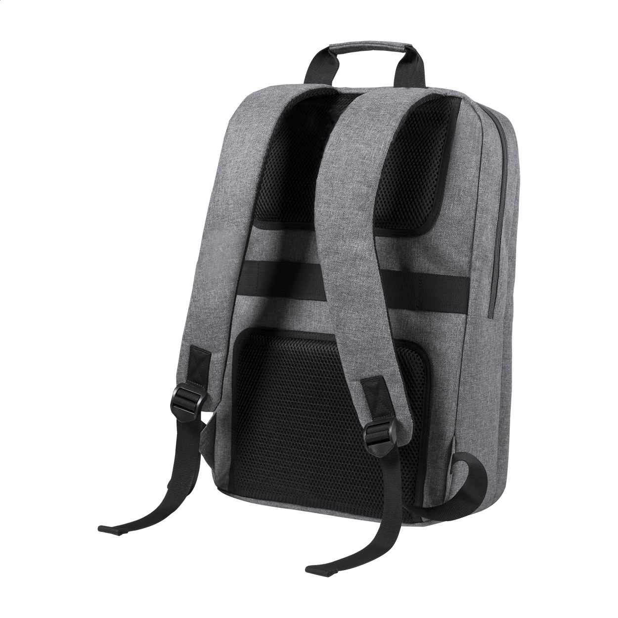 Polyesterový batoh s mnoha přihrádkami na zip, polstrovanými popruhy a přihrádkou na laptop (až 15 palců). 600D polyester.