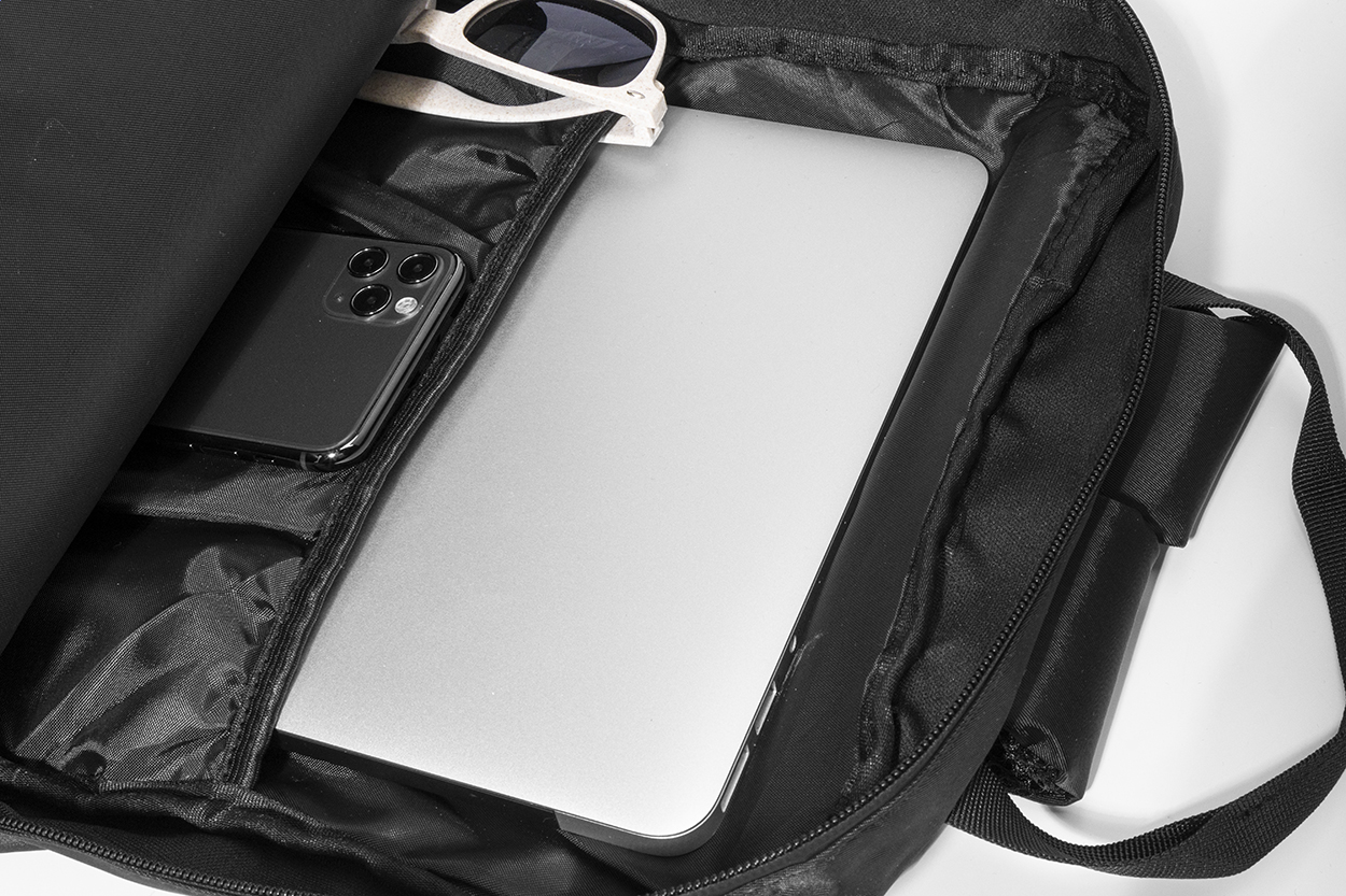 Batoh z RPET s přihrádkou na zip, 2 předními kapsami na zip, polstrovanou přihrádkou na notebook (15") a bočními síťovanými kapsami. S polstrovanými zády a ramenními popruhy, kapsou proti krádeži a popruhem na kolečkách. RPET keprový polyester s výrazným štítkem RPET.