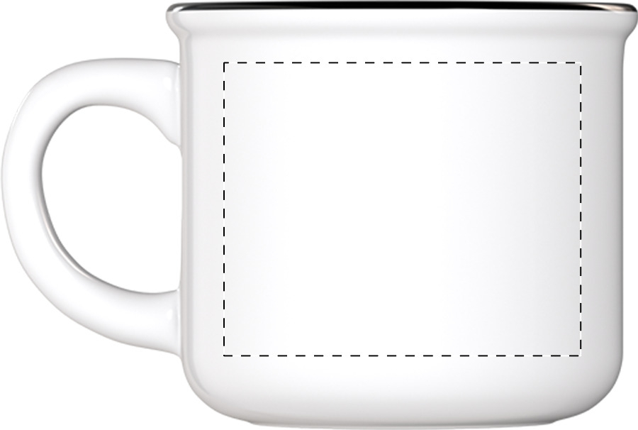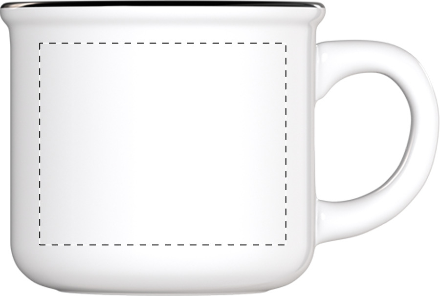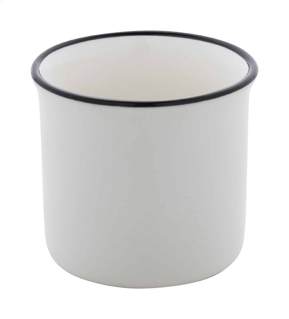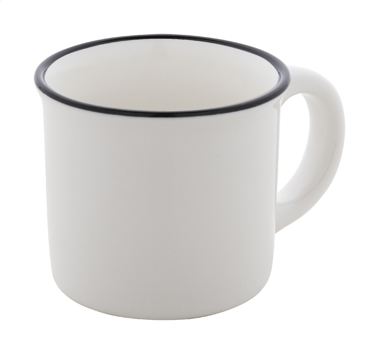 Mini vintage keramický hrnek s černým okrajem, bílým uvnitř a barevným vnějškem, 90 ml. V krabičce z kraftového papíru.