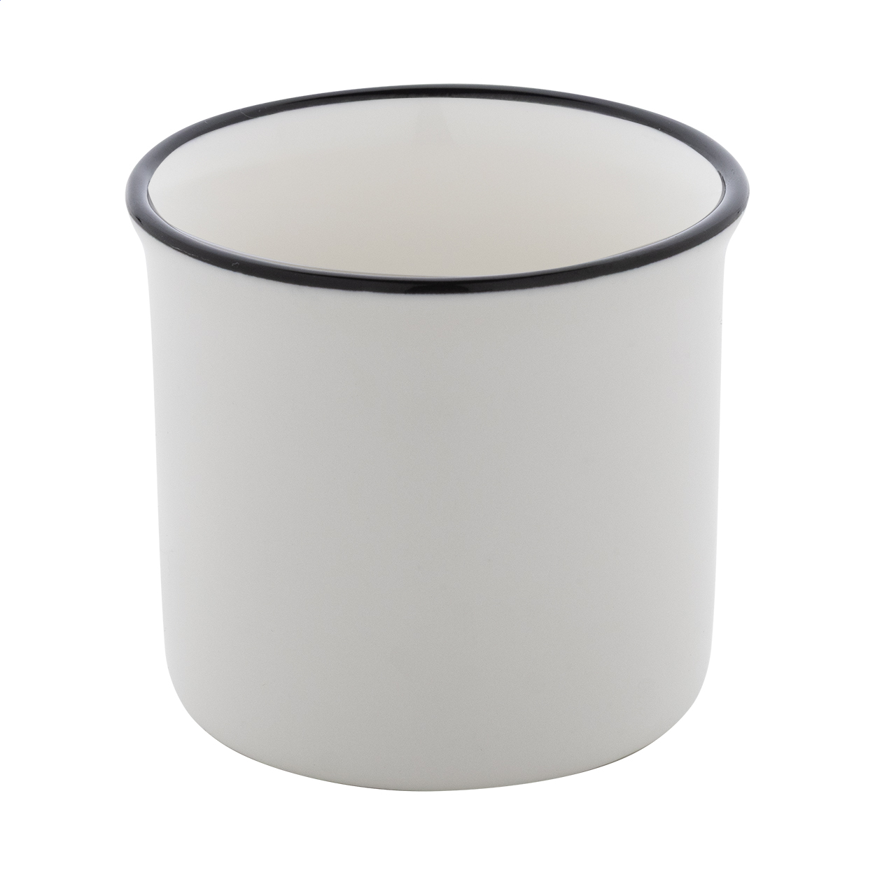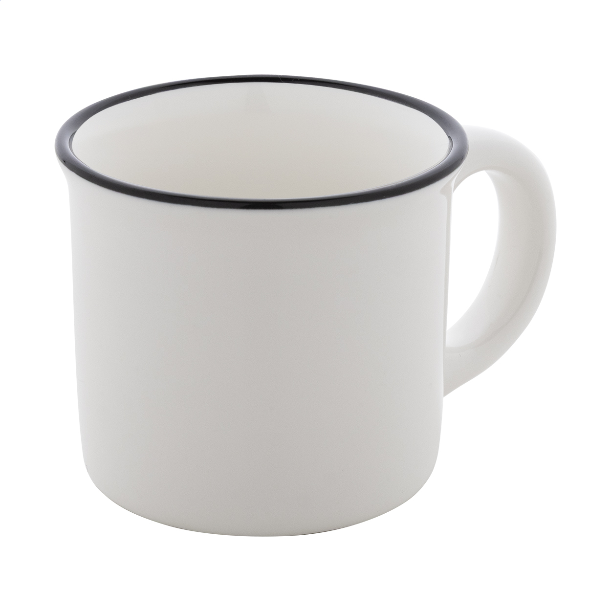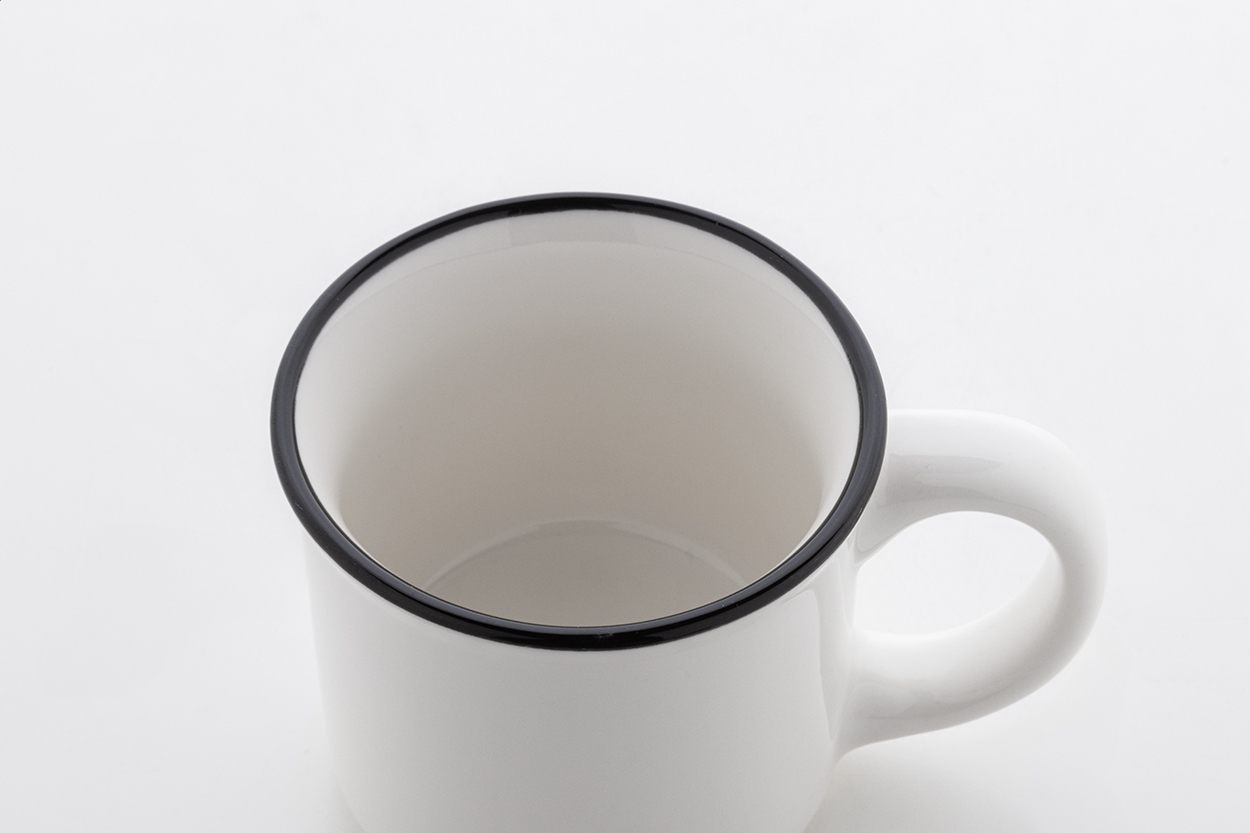 Mini vintage keramický hrnek s černým okrajem, bílým uvnitř a barevným vnějškem, 90 ml. V krabičce z kraftového papíru.
