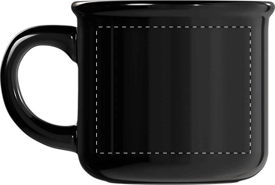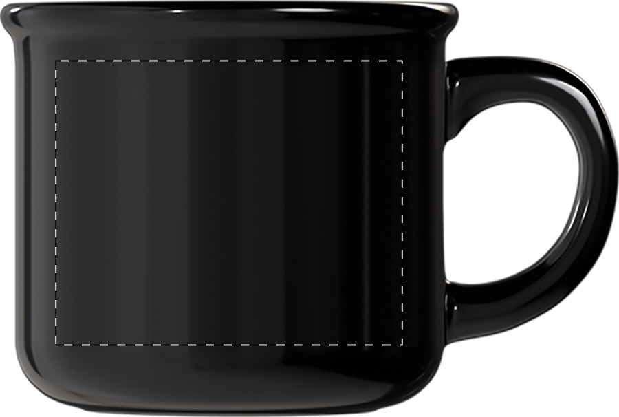 Mini vintage keramický hrnek s černým okrajem, bílým uvnitř a barevným vnějškem, 90 ml. V krabičce z kraftového papíru.