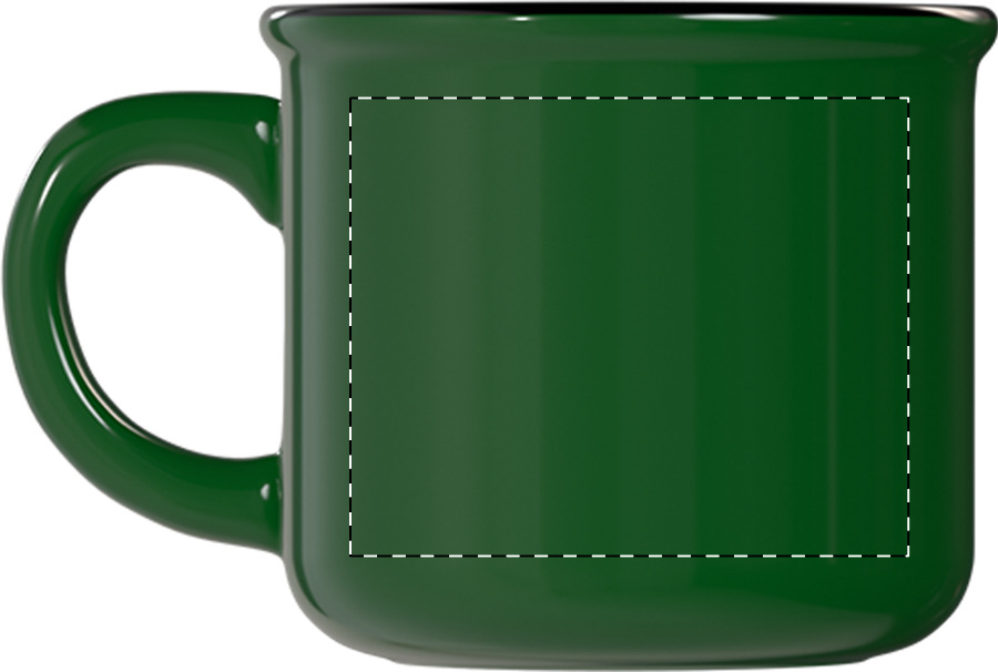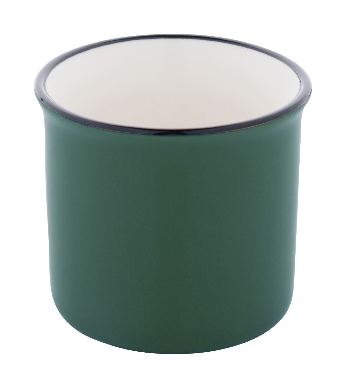 Mini vintage keramický hrnek s černým okrajem, bílým uvnitř a barevným vnějškem, 90 ml. V krabičce z kraftového papíru.