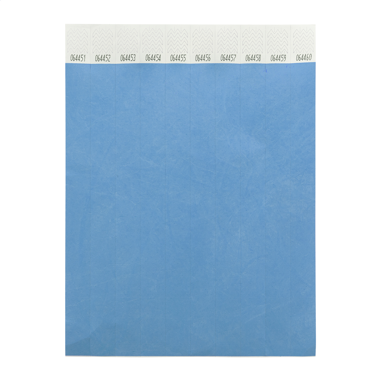Jeden arch 19 mm širokých tyvekových náramků (10 ks) s lepicím bezpečnostním uzávěrem a jedinečným číslováním.