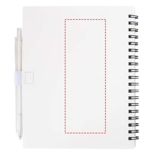 Poznámkový blok Niove s měkkou vazbou je vyroben z recyklovaného plastu a má 70 tečkovaných listů papíru o gramáži 70 g/m². Zápisník má zaoblené rohy a poutko na pero. Velikost zápisníku: 140 × 178 mm. Kuličkové pero je rovněž vyrobeno z recyklovaného plastu. Barva inkoustu: Modrá. Délka psaní: 1000 metrů. Rozměr hrotu: 1,0 mm.