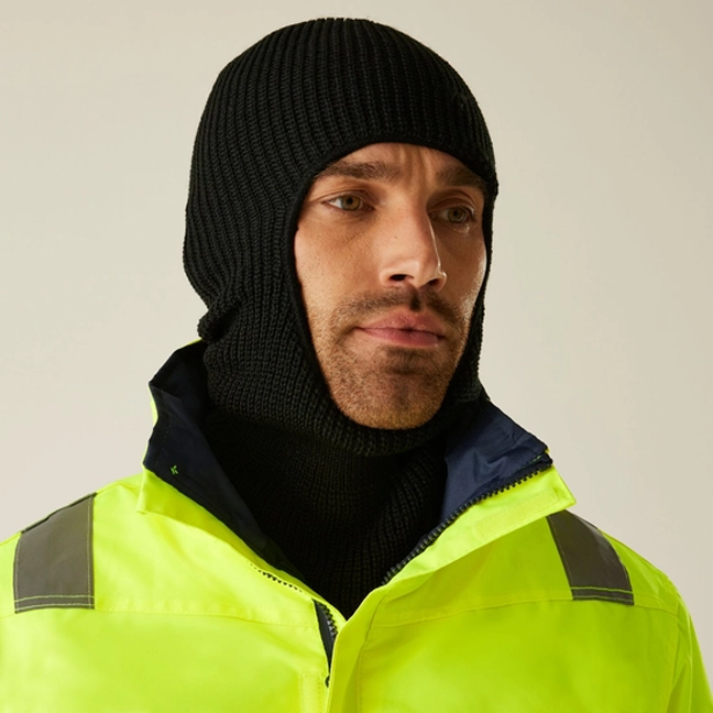 Pletená zimní kukla z plně žebrované polyakrylové tkaniny chrání hlavu i krk a nechává volnou část obličeje pro dobrý výhled a dýchání. Jednoduchý přiléhavý střih v barvě navy se hodí k pracovnímu i volnočasovému oblečení a díky univerzální velikosti sedí většině dospělých.